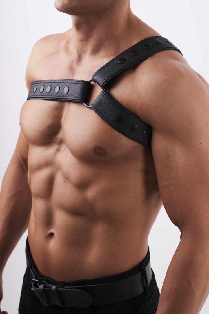 Schlinge die weichen 4 cm breiten Ledergürtel mit abgerundeten Kanten um Deine Brust und trage das Geschirr zu jedem möglichen Anlass.
