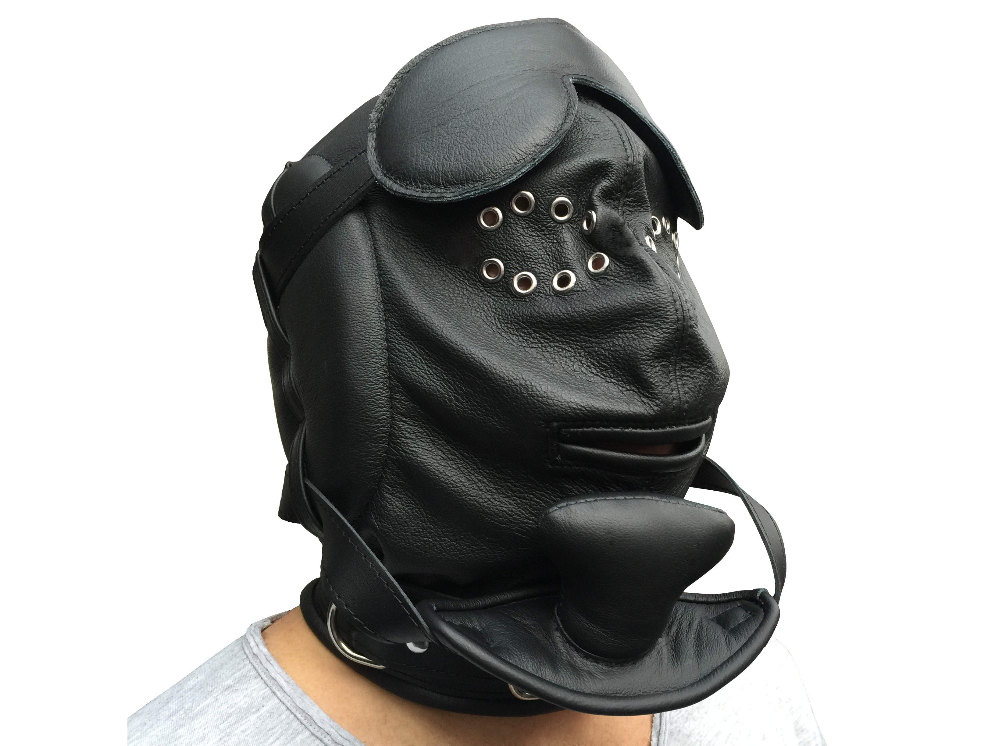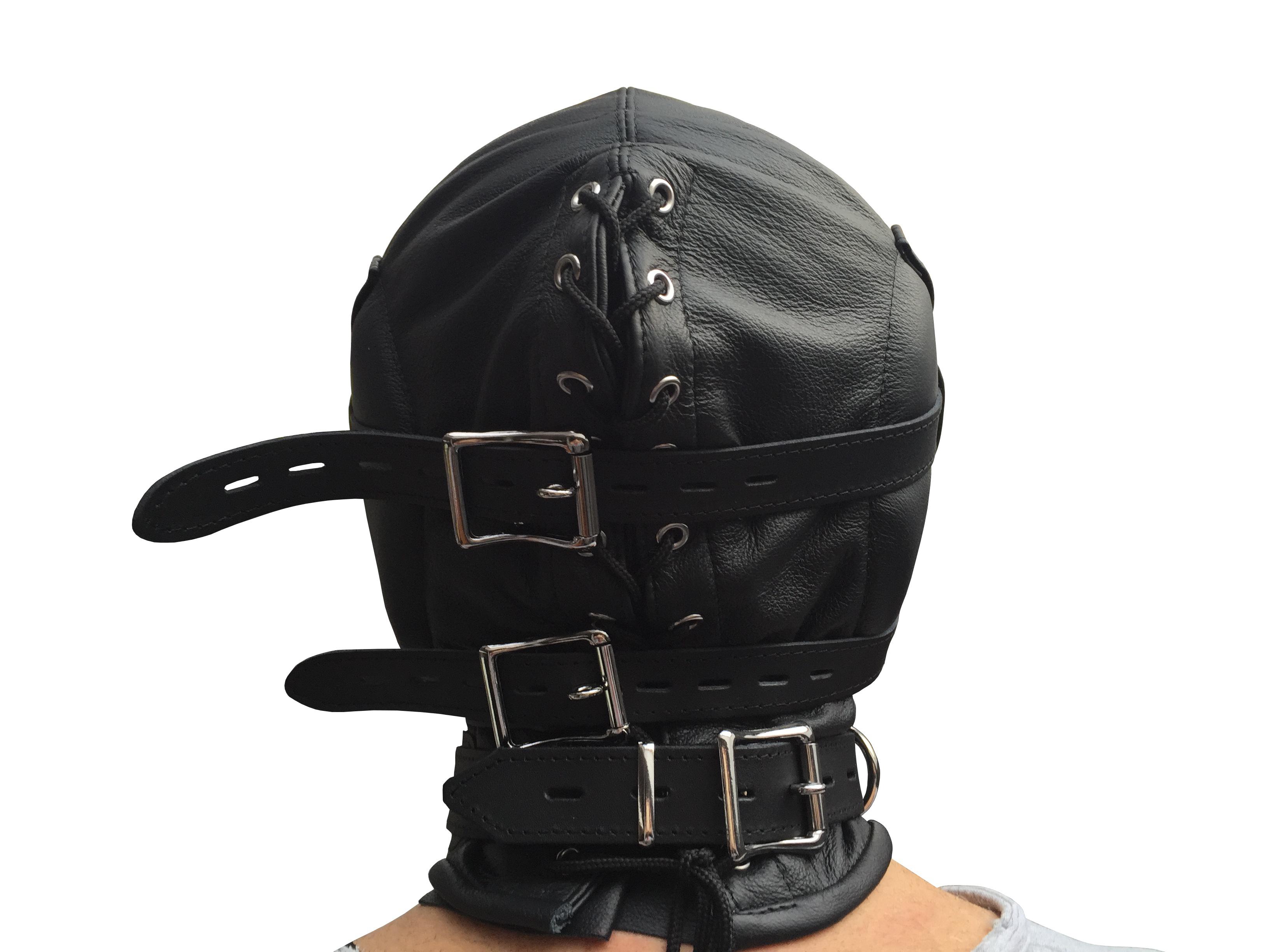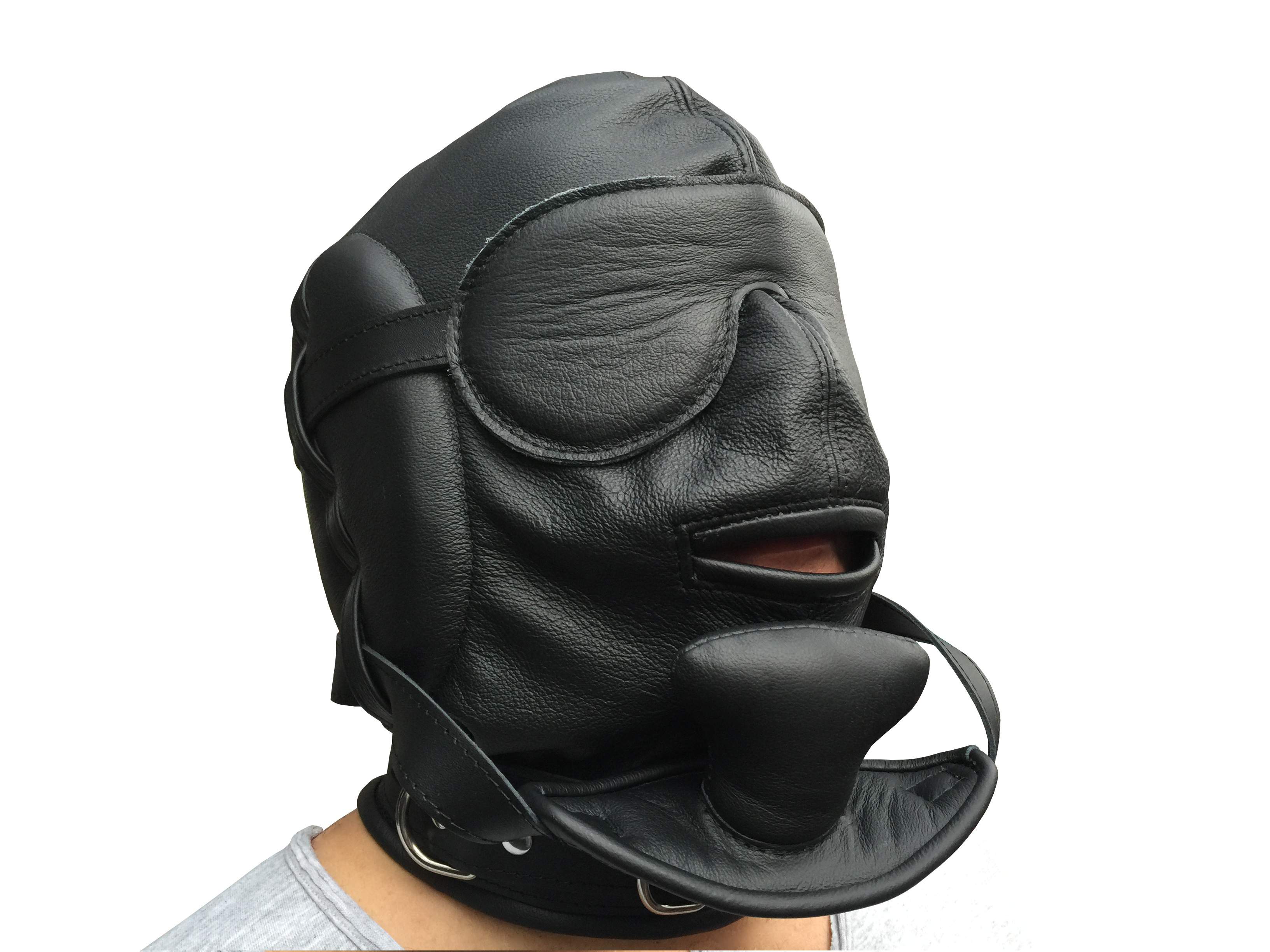 Die Maske hat zusätzlich eine abnehmbare und abschließbare Lederaugenbinde.
